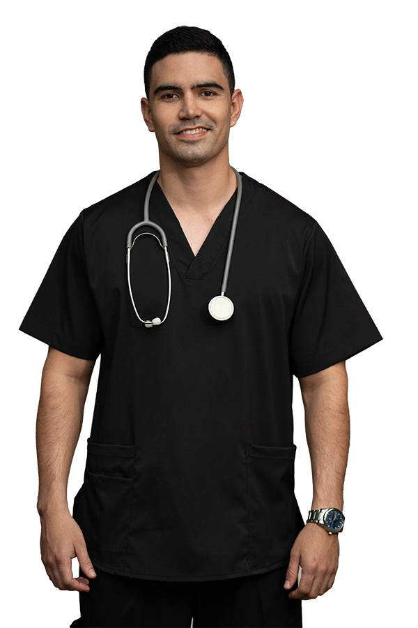 • Medical shirt in black antifluid fabric, with a V-neck, short sleeves, regular silhouette with side slits and two simple lower pockets