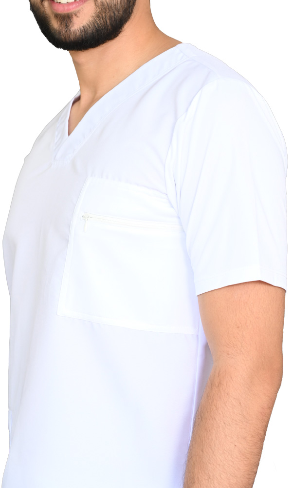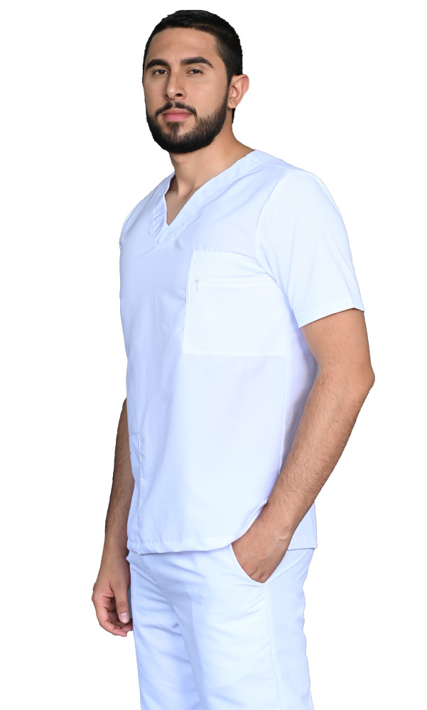 • Medical shirt in white antifluid fabric, with a V-neck, short sleeves and a regular silhouette with side slits. It also has a pocket on the upper left front with a horizontally oriented nylon closure and a welt pocket on the lower right.