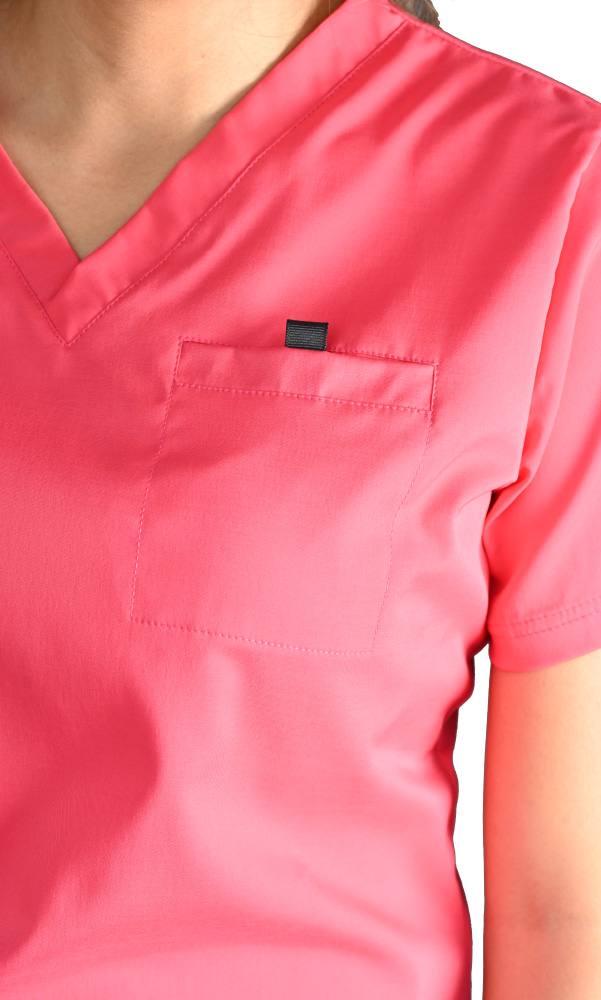Blusa médico en tela antifluido salmón, con cuello de pico, manga corta, silueta regular, aberturas laterales, espalda lisa, dos bolsillos inferiores sencillos y un bolsillo ribete en el frente