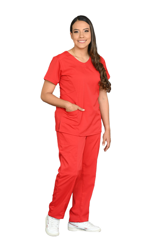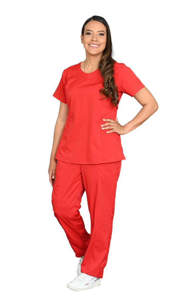 Medical blouse in red antifluid fabric, with a princess cut, round neck, short sleeves, side slits, regular slim silhouette, darts on the back and two simple pockets accompanied by an envelope pocket.